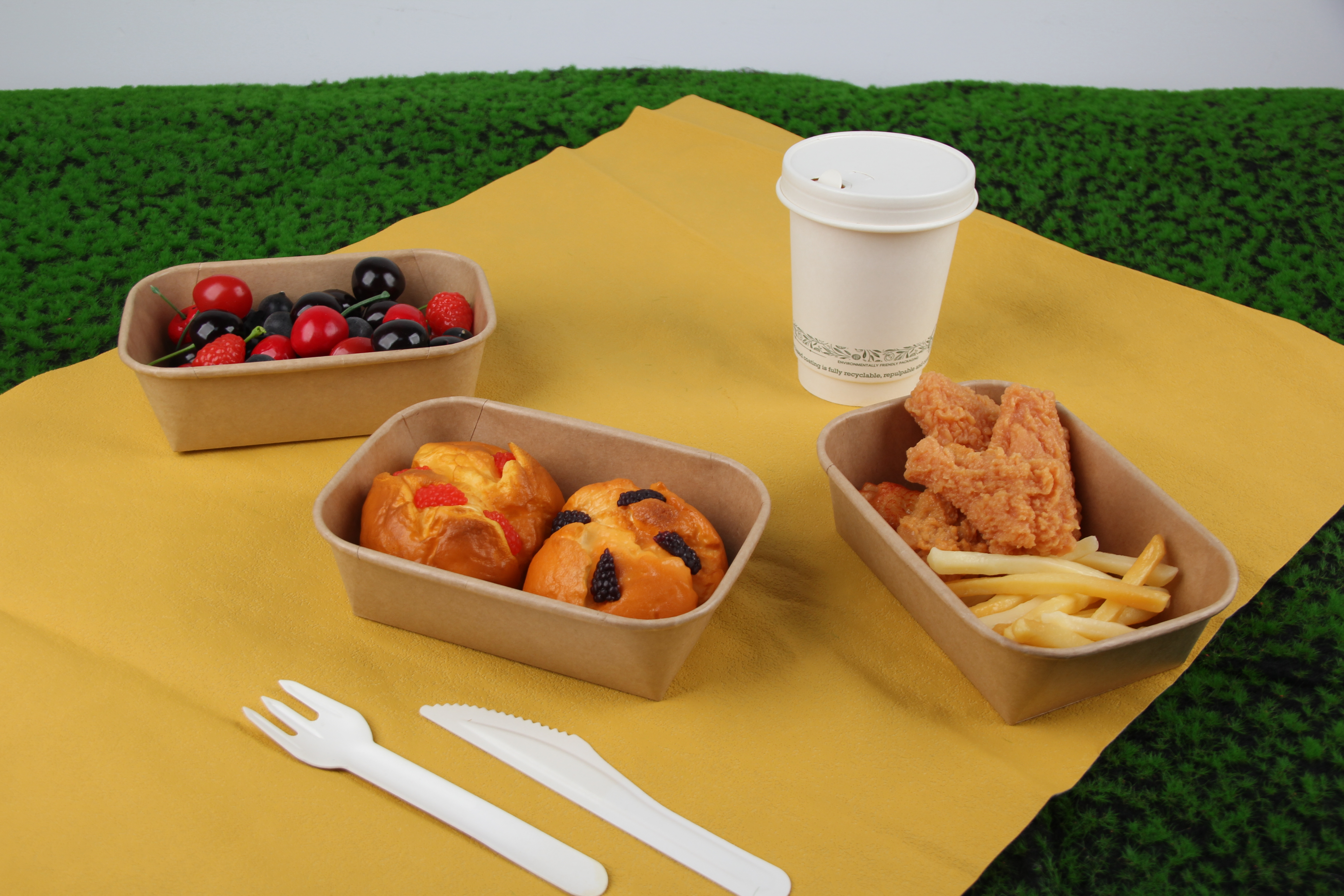 Eco-friendly paper trays that are harmless, stain-resistant, and ideal for food display. Suitable for staples, desserts, and snacks. The wide upper and narrow lower design is suitable for cutomer to lift with one hand. Made from PFAS-free food-grade materials, recyclable or compostable, and customizable in size, coating, and printing.